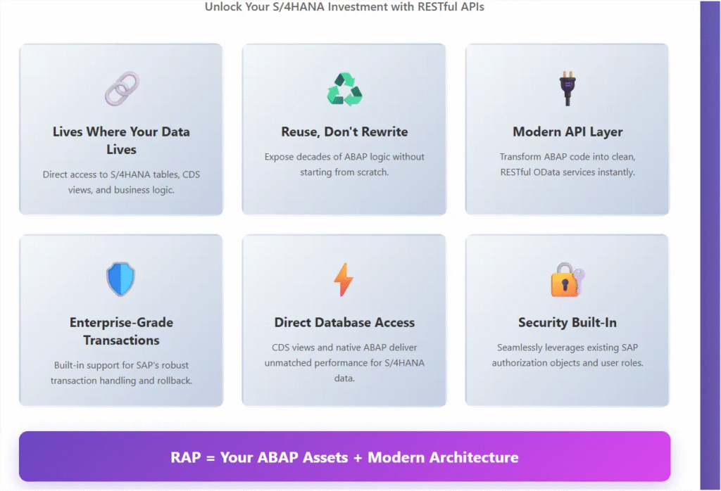 It’s about exposing your existing ABAP logic as modern RESTful APIs — safely, quickly, and cleanly.