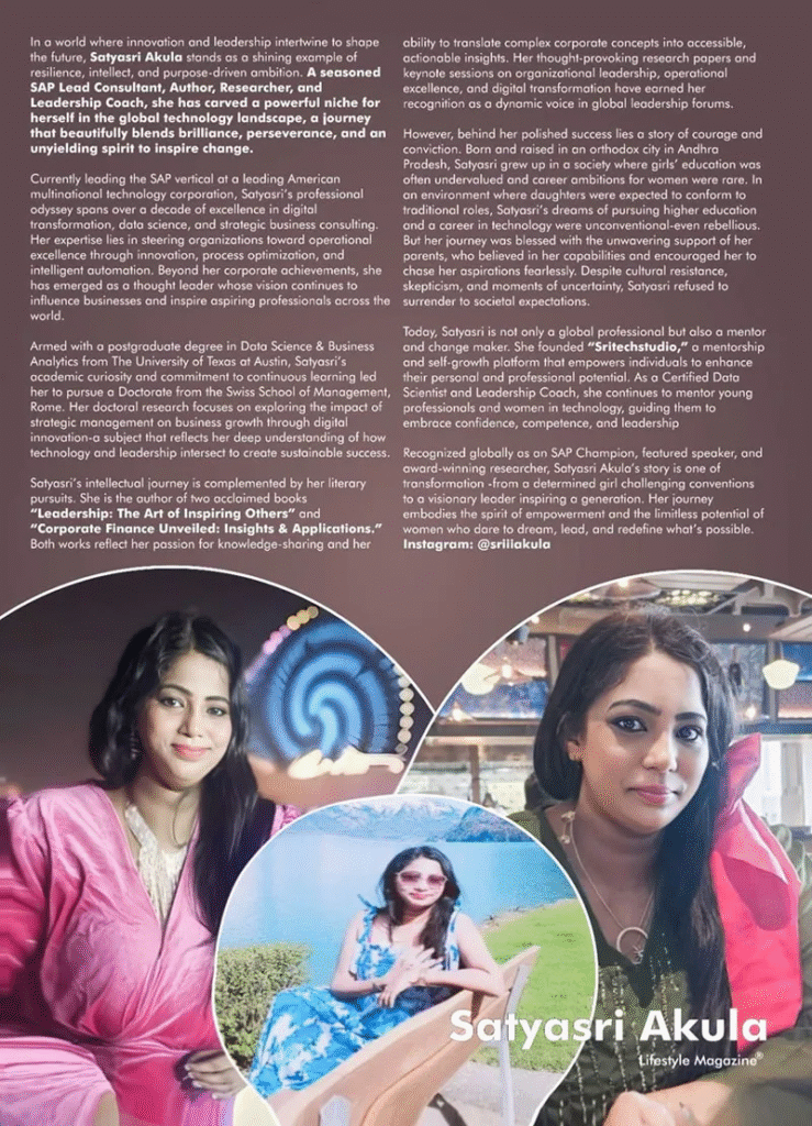 Being recognized by a magazine that honors the achievements of women across the globe feels truly special. It is both a moment of gratitude and a moment of reflection. The feature highlights my professional journey over the past decade, beginning with my work as an SAP Lead Consultant and growing into my roles as an author, researcher, and leadership coach with a strong focus on digital transformation, data science, and strategic consulting.